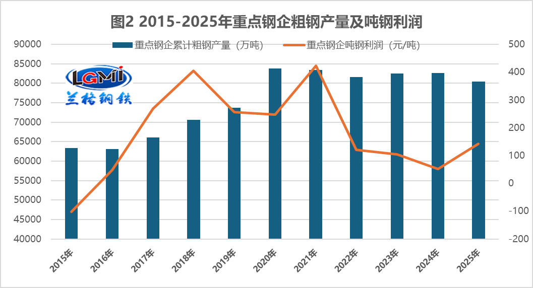 據(jù)中國(guó)鋼鐵工業(yè)協(xié)會(huì)權(quán)威統(tǒng)計(jì)數(shù)據(jù)顯示,2025年重點(diǎn)統(tǒng)計(jì)鋼鐵企業(yè)經(jīng)營(yíng)成績(jī)單亮點(diǎn)突出:累計(jì)營(yíng)業(yè)收入達(dá)6.1萬億元,雖受鋼材價(jià)格震蕩下行影響同比下降 3.1%,但降幅顯著小于市場(chǎng)預(yù)期;營(yíng)業(yè)成本控制成效顯著,降至5.7萬億元,同比下降4.5%,成本端收縮力度大于收入端回落幅度;利潤(rùn)總額實(shí)現(xiàn)1151億元,同比大幅增長(zhǎng)1.4倍,盈利規(guī)模實(shí)現(xiàn)跨越式修復(fù),成為行業(yè)發(fā)展的核心亮點(diǎn)。從鋼鐵產(chǎn)量來看,2025年重點(diǎn)鋼鐵企業(yè)在兼顧市場(chǎng)需求與供給優(yōu)化的前提下,產(chǎn)量結(jié)構(gòu)呈現(xiàn) "穩(wěn)中有調(diào)" 的特征;其中,重點(diǎn)鋼鐵企業(yè)粗鋼產(chǎn)量8.05億噸,占全國(guó)粗鋼總產(chǎn)量的83.8%,同比下降2.7%,累計(jì)日產(chǎn)220.46萬噸;生鐵產(chǎn)量 7.32 億噸,占全國(guó)生鐵產(chǎn)量的87.6%,同比微降0.7%,累計(jì)日產(chǎn)200.56萬噸;鋼材產(chǎn)量 8.26億噸,占全國(guó)鋼材產(chǎn)量的57.1%,同比增長(zhǎng)0.9%,累計(jì)日產(chǎn)226.22萬噸。從2015-2025年長(zhǎng)期趨勢(shì)來看(詳見圖 1),重點(diǎn)鋼企粗鋼產(chǎn)量占全國(guó)比重呈現(xiàn)穩(wěn)步提升態(tài)勢(shì),從20159年的74.1% 逐步攀升至2025年的83.8%,反映出行業(yè)集中度持續(xù)優(yōu)化,頭部企業(yè)的規(guī)模優(yōu)勢(shì)與資源整合能力不斷凸顯。