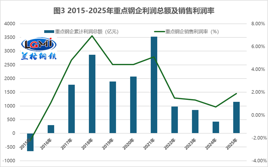從盈利能力來看,2025年重點(diǎn)鋼鐵企業(yè)盈利水平實(shí)現(xiàn)實(shí)質(zhì)性改善,噸鋼盈利達(dá)到143元,較上年同期增加91元,不僅一舉扭轉(zhuǎn)了此前盈利低迷的局面,還較鋼鐵行業(yè)整體噸鋼盈利高出29元,彰顯出重點(diǎn)鋼企在成本控制與產(chǎn)品溢價(jià)方面的核心優(yōu)勢(shì)(詳見圖 2)。從盈利效率來看,2025年重點(diǎn)鋼鐵企業(yè)成本利潤(rùn)率為2.02%,較上年上升1.27個(gè)百分點(diǎn);銷售利潤(rùn)率為1.89%,較上年上升1.18個(gè)百分點(diǎn)(詳見圖 3),兩大利潤(rùn)率指標(biāo)的同步回升,標(biāo)志著企業(yè)經(jīng)營(yíng)質(zhì)量的穩(wěn)步提升,盈利的可持續(xù)性顯著增強(qiáng)。